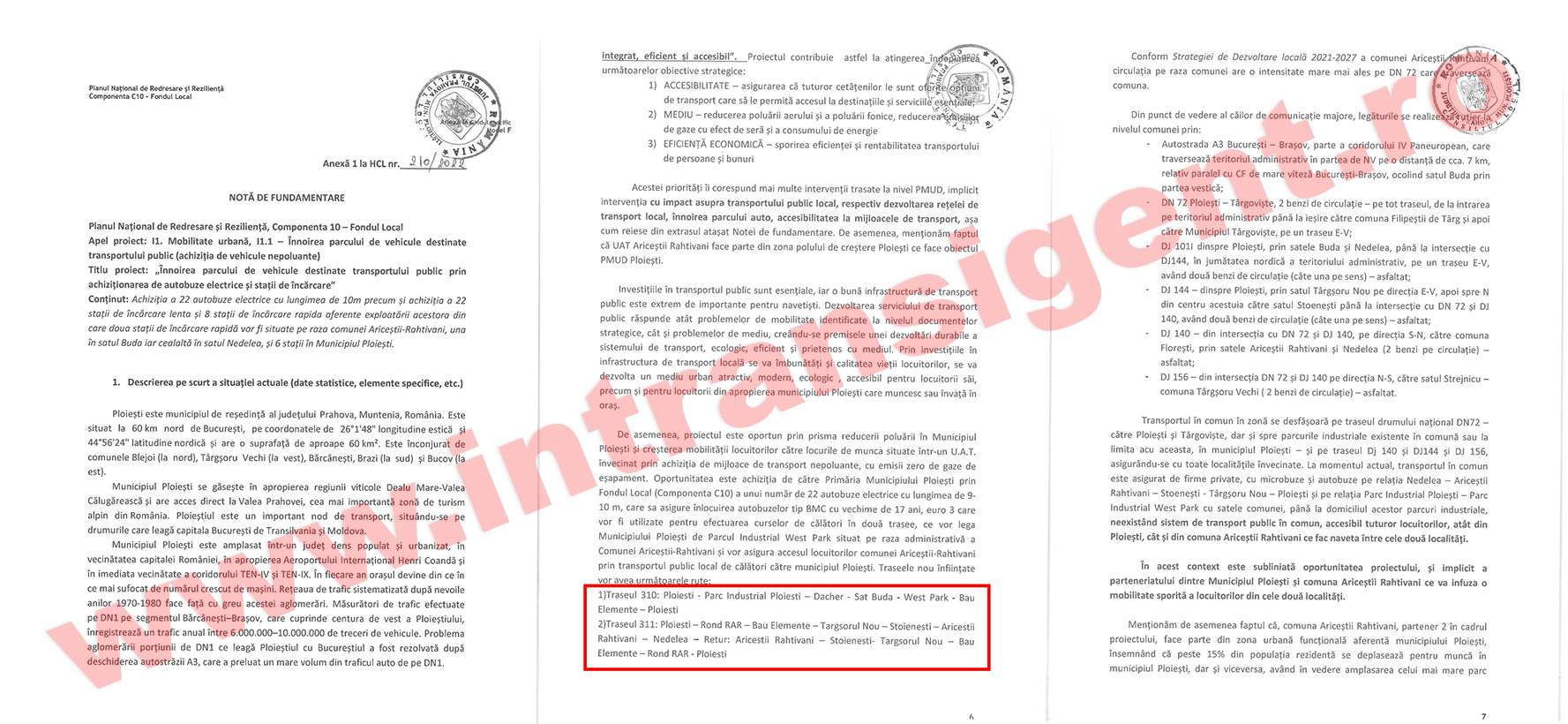 Primăria Ploiești a semnat cu surle și trâmbițe nota de fundamentare pentru achiziția a 22 de autobuze electrice prin Componenta C10 – Fondul Local (PNRR). Scopul era formulat limpede: traseele 310 și 311, legătura vitală dintre municipiu, comuna Ariceștii Rahtivani și Parcul Industrial West Park., după cum vedeți în extrasul din nota de fundamentare a proiectului european.
