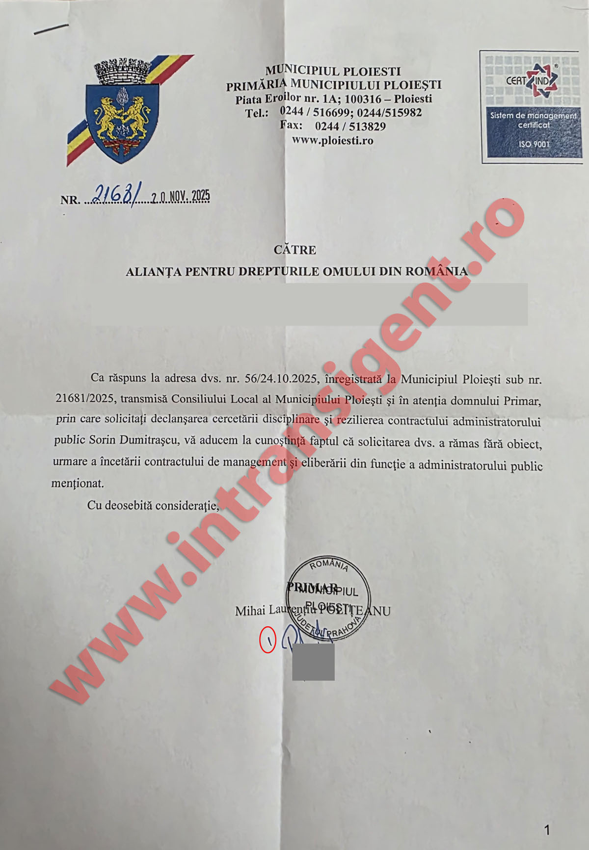 cererea ta, înregistrată frumos cu număr, dată, ștampilă, traseu prin Consiliul Local și „în atenția domnului Primar”, „a rămas fără obiect, urmare a încetării contractului de management și eliberării din funcție a administratorului public menționat”.