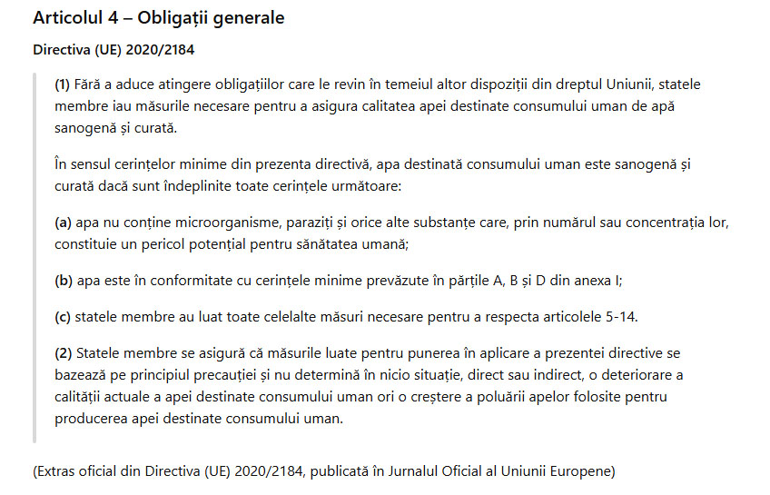 Articolul 4 spune clar: apa potabilă nu trebuie să conțină substanțe care pot pune sănătatea în pericol. Dacă populației i se spune „nu consumați apa”, atunci apa respectivă nu mai îndeplinește criteriile directivei. Nu este o interpretare jurnalistică. Este concluzia logică a textului legal.