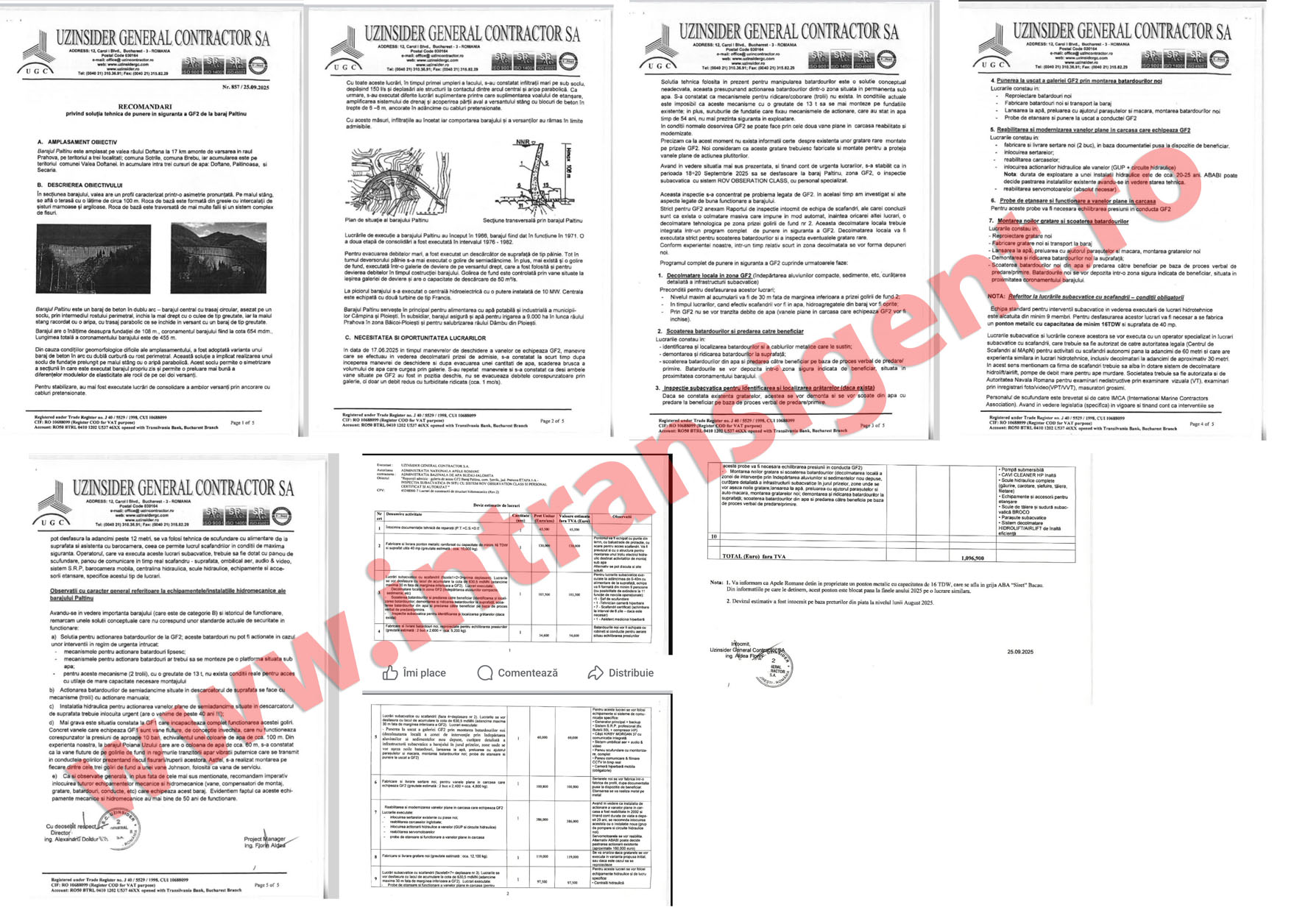 Raportul NEMO PRO DIVING SRL, întocmit pentru UZINSIDER General Contractor SA, are ca obiect inspecția subacvatică a sistemului GF2 – golirea de fund nr. 2 a barajului Paltinu, folosind echipamente ROV. Este un document care consemnează fapte măsurabile: adâncimi exacte, timpi operaționali, limite tehnice, elemente identificate și, la fel de important, elemente care nu mai pot fi identificate.