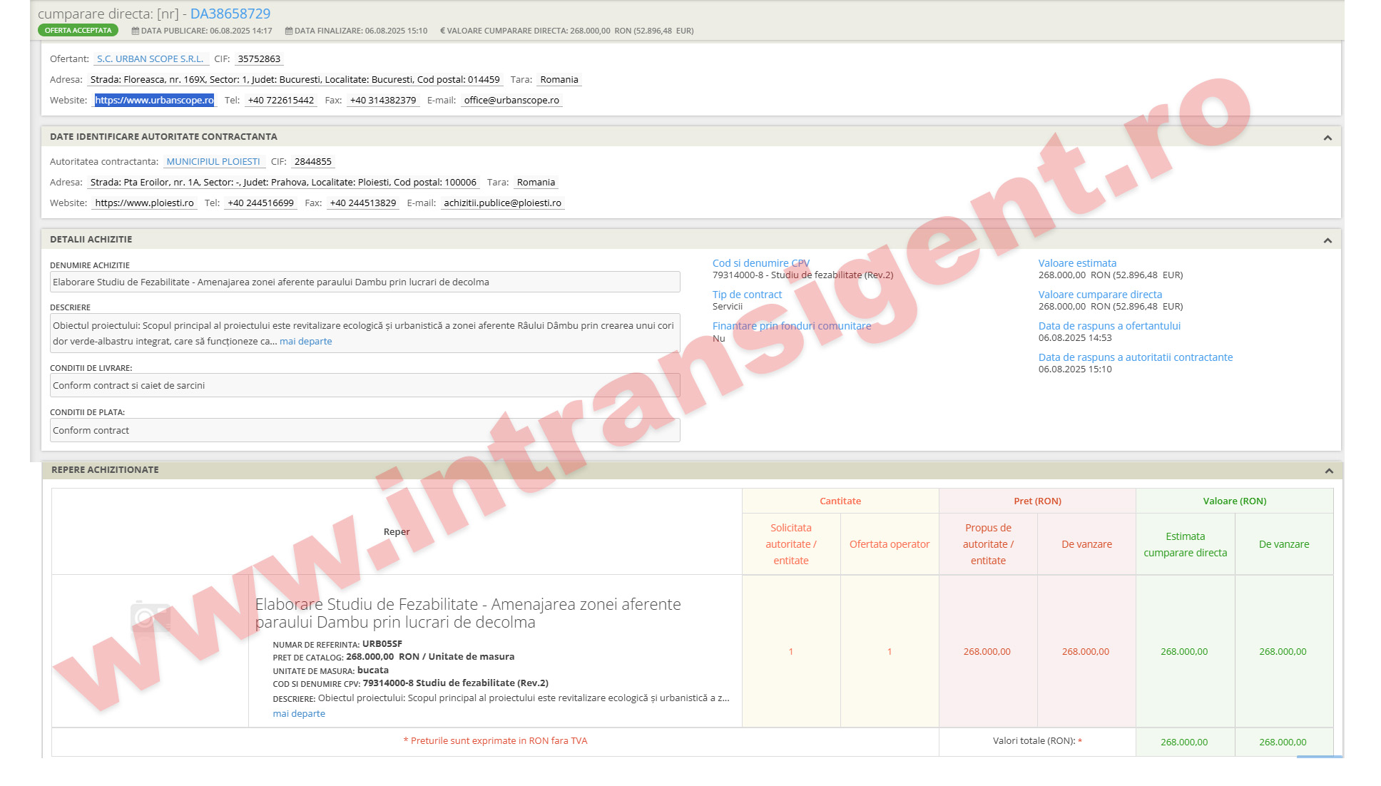 | 6 aug 2025 | Ploiești | SF “Dâmbu – decolmatare” | 268.000 lei | Publicată-finalizată în 53 min; la limită de prag | date imagini OCR și analiza noastră |