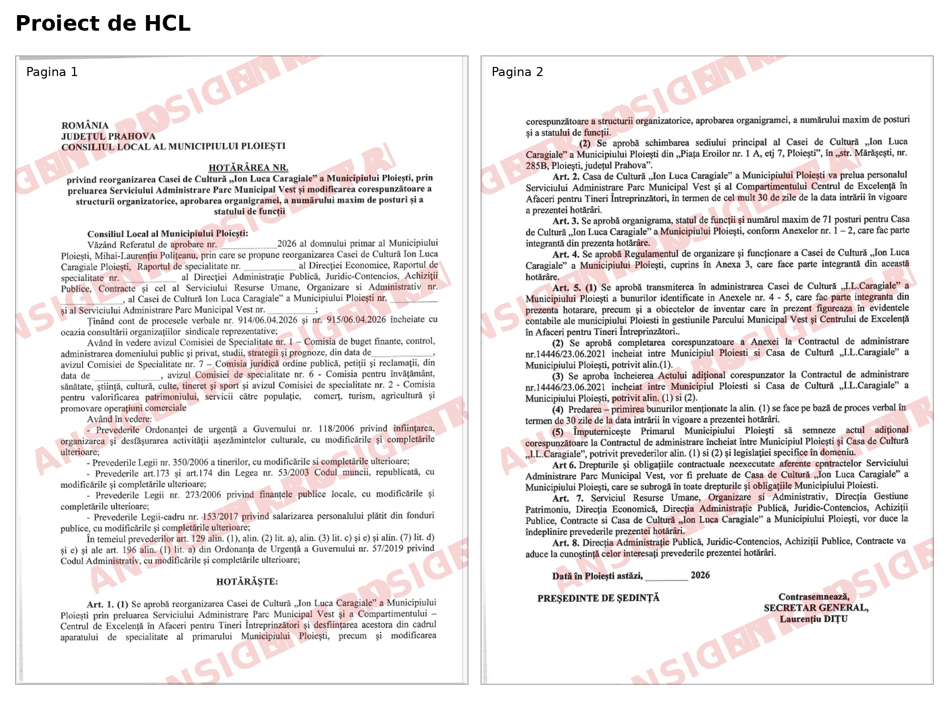 Textul proiectului spune limpede că se aprobă reorganizarea Casei de Cultură „Ion Luca Caragiale” prin preluarea Serviciului Administrare Parc Municipal Vest și a Centrului de Excelență, că se schimbă sediul principal, că personalul este preluat în termen de 30 de zile, că se aprobă noua organigramă și noul stat de funcții, că se adoptă regulamentul noii structuri și că sunt transferate bunuri, inventar, evidențe contabile, drepturi și obligații contractuale neexecutate. Cu alte cuvinte, nu se mută doar un concept sau o formulă managerială. Se mută tot ce ține de funcționarea vie a acestor structuri.