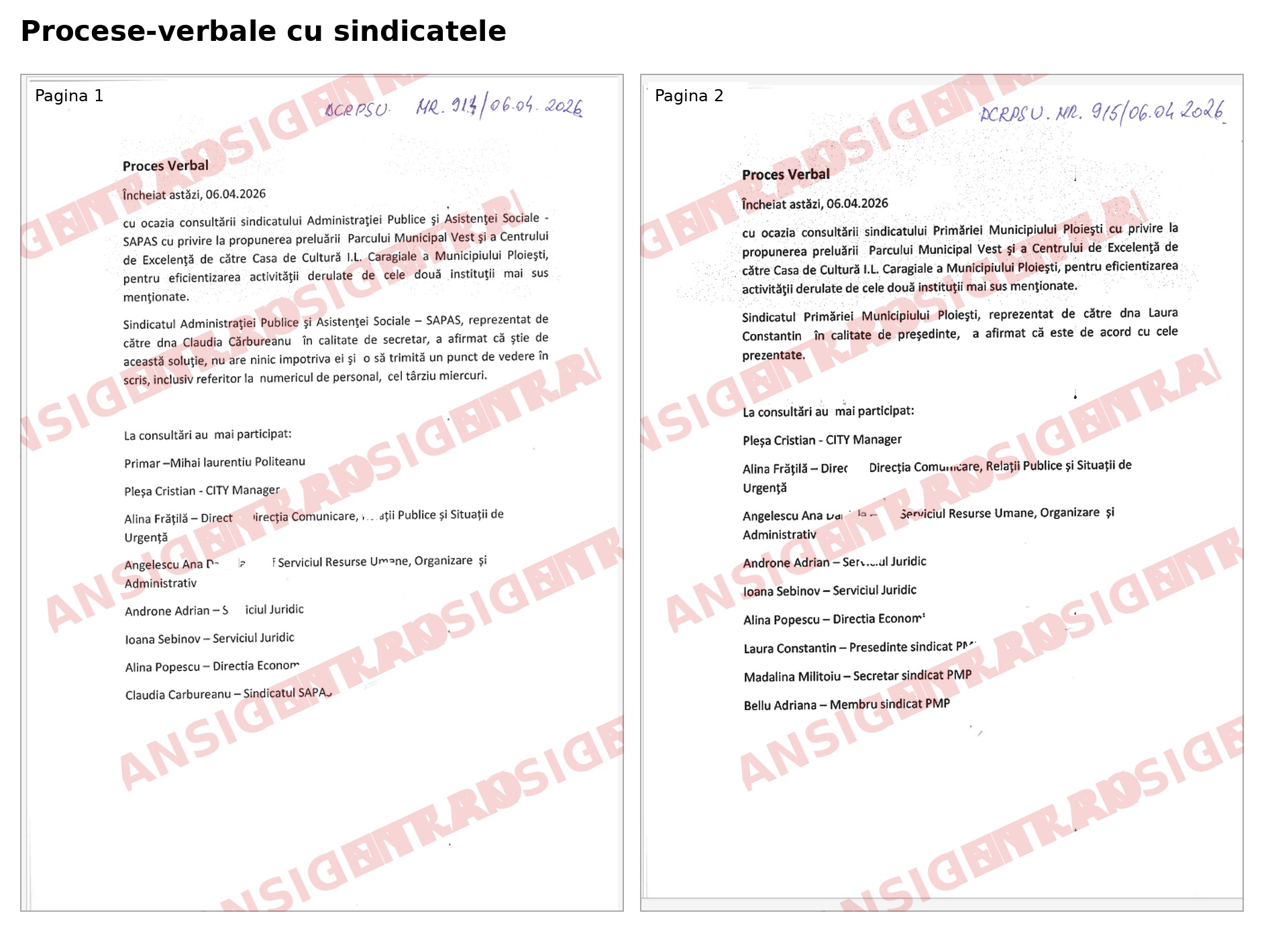 Dacă există un capitol care ar trebui să le dea de gândit chiar și celor mai indulgenți cititori ai acestei povești administrative, acela este cel al așa-zisei consultări sindicale. Procesele-verbale din 06.04.2026 ar merita studiate în școlile de administrație drept model de consultare formală și subțire până la ridicol. Acestea nu arată vigilență, negociere sau apărare a intereselor salariaților. Arată, mai degrabă, o formalitate bifată în grabă, cu o lejeritate care frizează iresponsabilitatea.