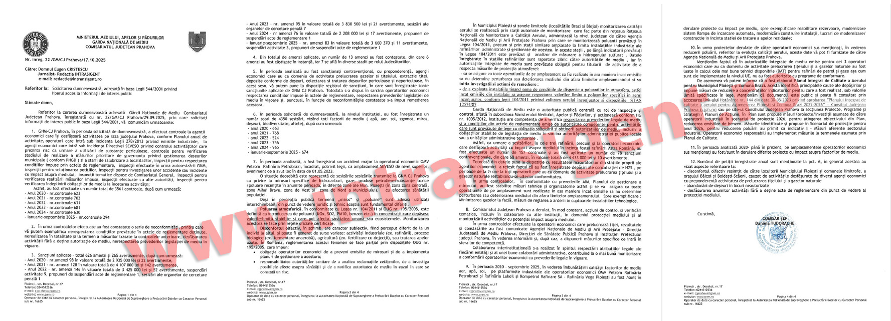 Conform documentului semnat de comisarul-șef Daniela Tudorache, în perioada 2020 – septembrie 2025, Garda de Mediu Prahova a efectuat 3.561 de controale la agenți economici care își desfășoară activitatea în județ, dintre care o parte intră sub incidența Legii 278/2013 privind emisiile industriale și a Directivei SEVESO. Verificările au vizat prevenirea poluării, respectarea legislației de mediu, reducerea riscurilor și îmbunătățirea calității factorilor de mediu (aer, apă, sol, zgomot, miros, biodiversitate).