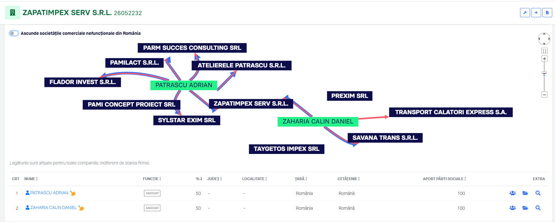 • În același timp, figurează ca asociat unic al unei alte societăți, al cărei asociat este SC Transport Călători Express S.A. (firma publică condusă de el). Acest raport circular între pozițiile publică și privată creează o structură care contravine principiilor legislative privind transparența și imparțialitatea.