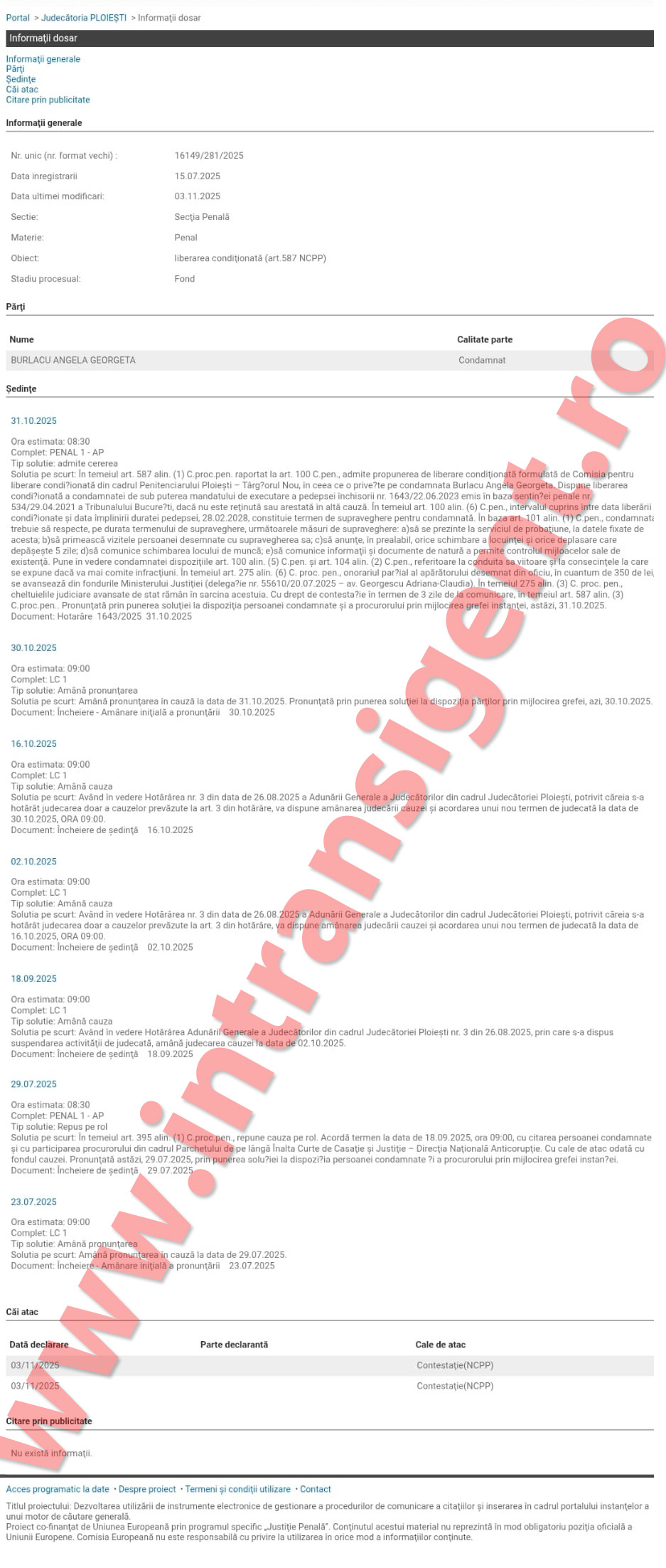 Pe 3 noiembrie 2025, Direcția Națională Anticorupție (DNA) a formulat contestație împotriva hotărârii de liberare condiționată pronunțate de Judecătoria Ploiești.