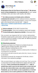 Pentru că pe unde taie Mihai Polițeanu lemne, Intransigent adună surcele, am luat la puricat ce a scris pe pagina sa despre „marele” proiect „Asigurarea mobilității traficului prin prelungirea legăturii rutiere și de transport public între Gara de Sud și Gara de Vest”, începând din 18 decembrie 2024 încoace, timp în care a amăgit ploieștenii. Dacă a fost un plan premeditat pentru ca acest proiect să pice, deși s-a lăudat cu el în campania electorală, pentru a ajunge la împrumutul de 200 de milioane de la BEI și a nu accesa fondurile europene cu finanțare nerambursabilă conform Ghidul Solicitantului pentru apelul PRSM/414/PRSM_P3/OP2/RSO2.8/PRSM_A26 – Mobilitate urbană , timpul ne va demonstra…sau organele abilitate.