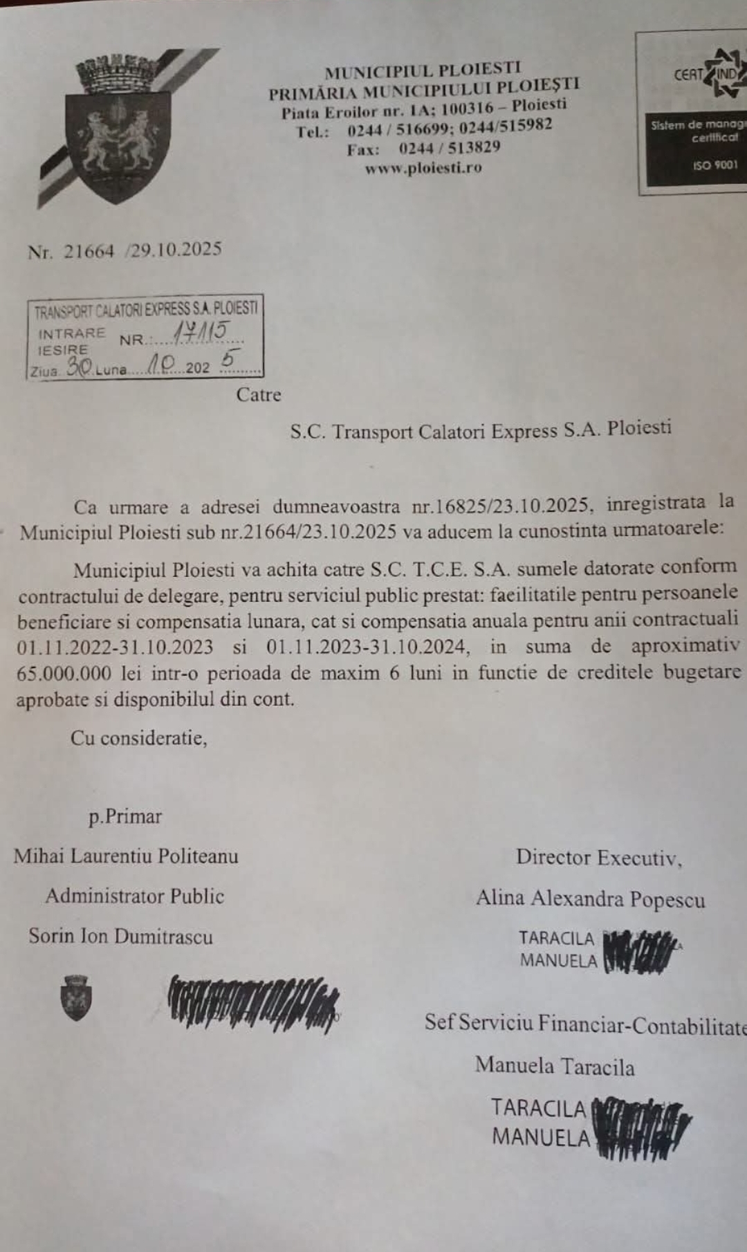 Un document oficial emis de Primăria Municipiului Ploiești, semnat de primarul Mihai Laurențiu Polițeanu și înregistrat cu nr. 21664/29.10.2025, confirmă că municipalitatea are de achitat către S.C. Transport Călători Express S.A. Ploiești (TCE) o datorie de aproximativ 65 milioane de lei, aferentă compensațiilor pentru facilitățile de transport și serviciile prestate în anii 2022–2024.