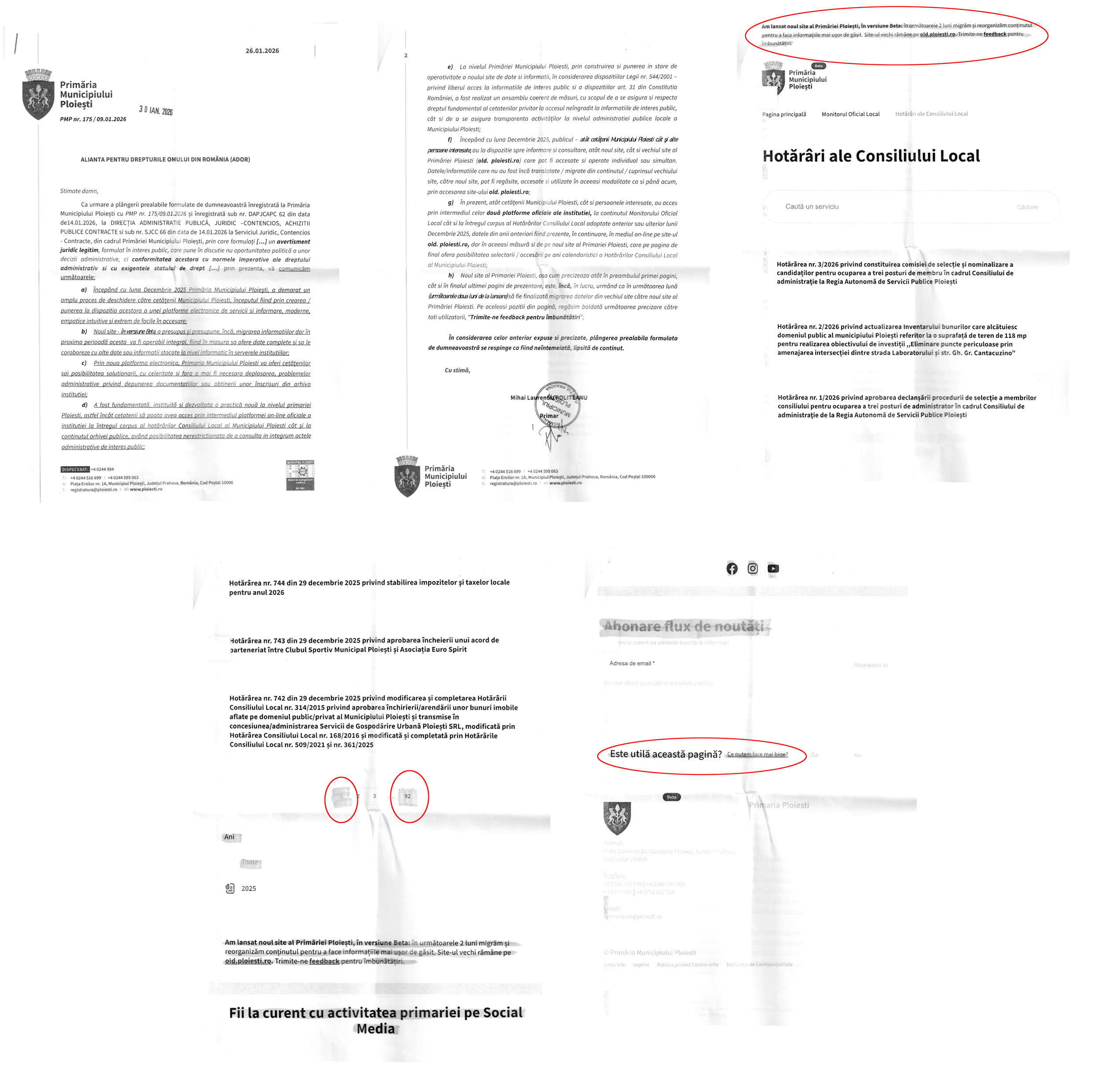 În documentele oficiale transmise ca răspuns la solicitările formulate în baza Legii nr. 544/2001, Primăria Municipiului Ploiești face o afirmație fermă, lipsită de orice nuanțare: „în prezent, cetățenii au acces, prin intermediul celor două platforme oficiale, la întregul corpus al hotărârilor Consiliului Local”. Mesajul este clar și categoric. Din punctul de vedere al instituției, problema transparenței este rezolvată.