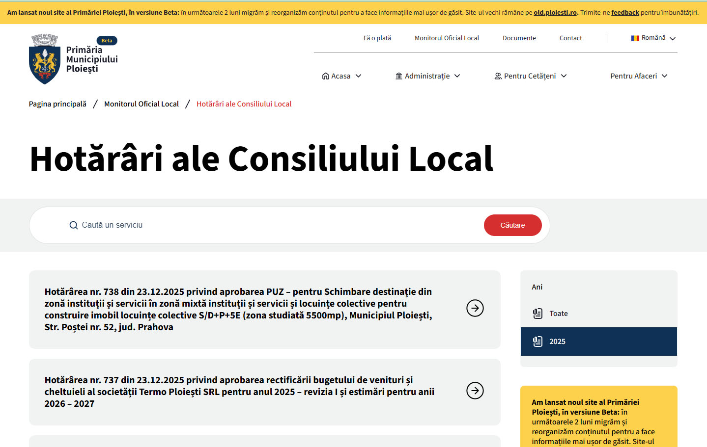 Primăria Municipiului Ploiești afirmă oficial, fără ezitare, că „cetățenii au acces la întregul corpus al hotărârilor Consiliului Local”, fie prin intermediul noului site, fie prin vechiul portal old.ploiesti.ro. Este o afirmație categorică, formulată ca un fapt împlinit. Doar că este contrazisă de realitatea verificabilă din propriile platforme ale instituției.