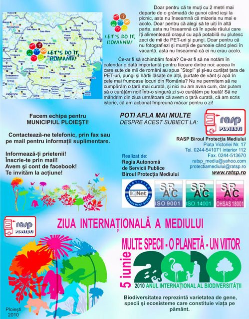 Lansarea proiectului de constientizare si implicare a cetatenilor in colectarea selectiva a deseurilor de echipamente electrice si electronice in parteneriat cu CCR Romania, ce se va derula in perioada 05.06.2010 – 01.04.2011, prin organizarea tombolei “Protejeaza natura” Detalii fiind postate pe site www.ratsp.ro si www.ploiesti.ro;