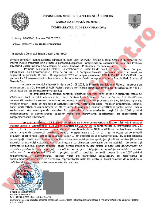 Rezultatul? O amendă usturătoare aplicată de Garda Națională de Mediu: 261.370 lei. Da, ați citit bine… peste un sfert de milion de lei, bani pe care îi plătește Municipiul Ploiești , adică noi, cetățenii, nu Politeanu, care a semnat singur și cu de la sine putere blocarea bulevardului pentru 21 de săptămâni.