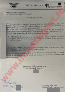 - Ordinul intern emis de Metrorex, prin care toți angajații sunt obligați să își actualizeze documentele de evidență militară, conform Legii 446/2006.