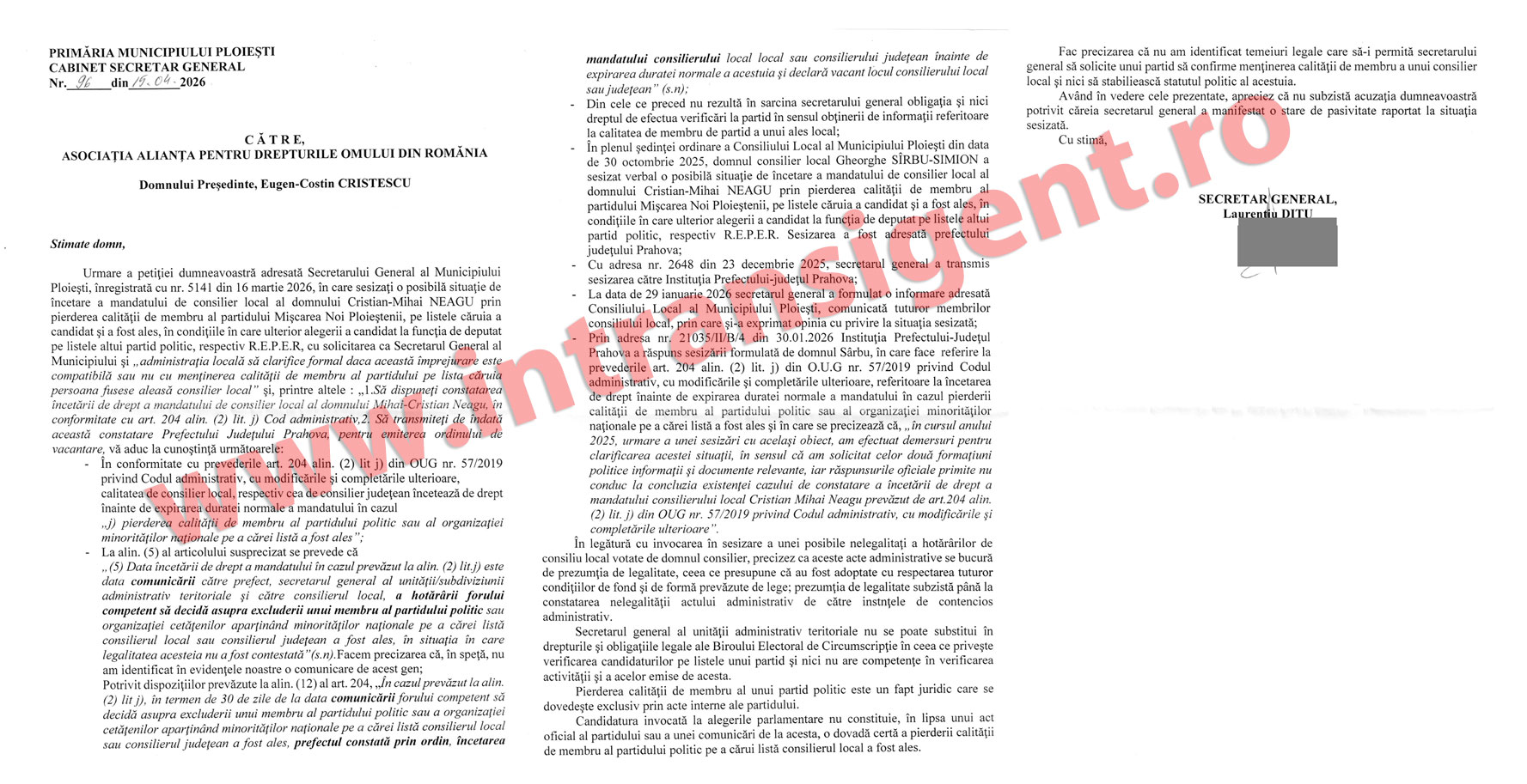 Alianța pentru Drepturile Omului din România, prin președintele Eugen-Costin Cristescu, a făcut o nouă încercare de a obține clarificări oficiale. Demersul a fost îndreptat atât către Secretarul General al Municipiului Ploiești, cât și către prefectul județului Prahova, iar miza este una simplă în aparență, dar extrem de gravă în fond: a continuat sau nu Cristian-Mihai Neagu să exercite funcția de consilier local după ce ar fi pierdut calitatea de membru al partidului pe lista căruia a fost ales?